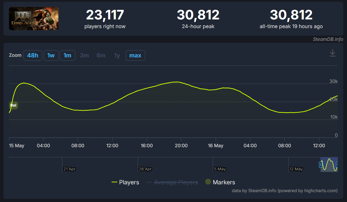 Doom: The Dark Ages only managed to obtain a peak concurrent player count of just 30,812 in its first day of release, less than half of what Dragon Age: The Veilguard did back at the end of October.