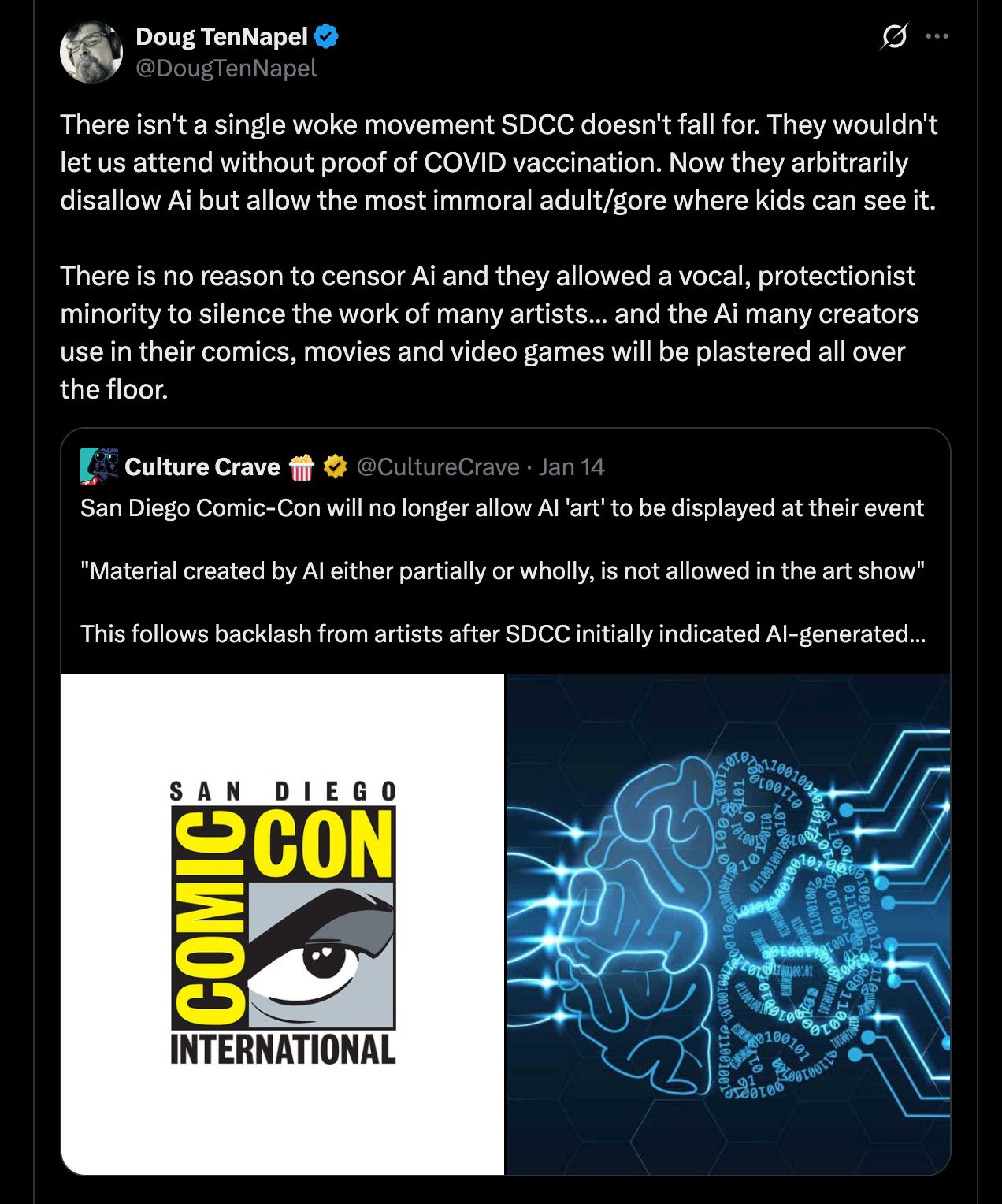 Doug TenNapel blasted the move on X, saying, “There isn't a single woke movement SDCC doesn't fall for. They wouldn't let us attend without proof of COVID vaccination. Now they arbitrarily disallow Ai but allow the most immoral adult/gore where kids can see it. There is no reason to censor Ai and they allowed a vocal, protectionist minority to silence the work of many artists... and the Ai many creators use in their comics, movies and video games will be plastered all over the floor.”