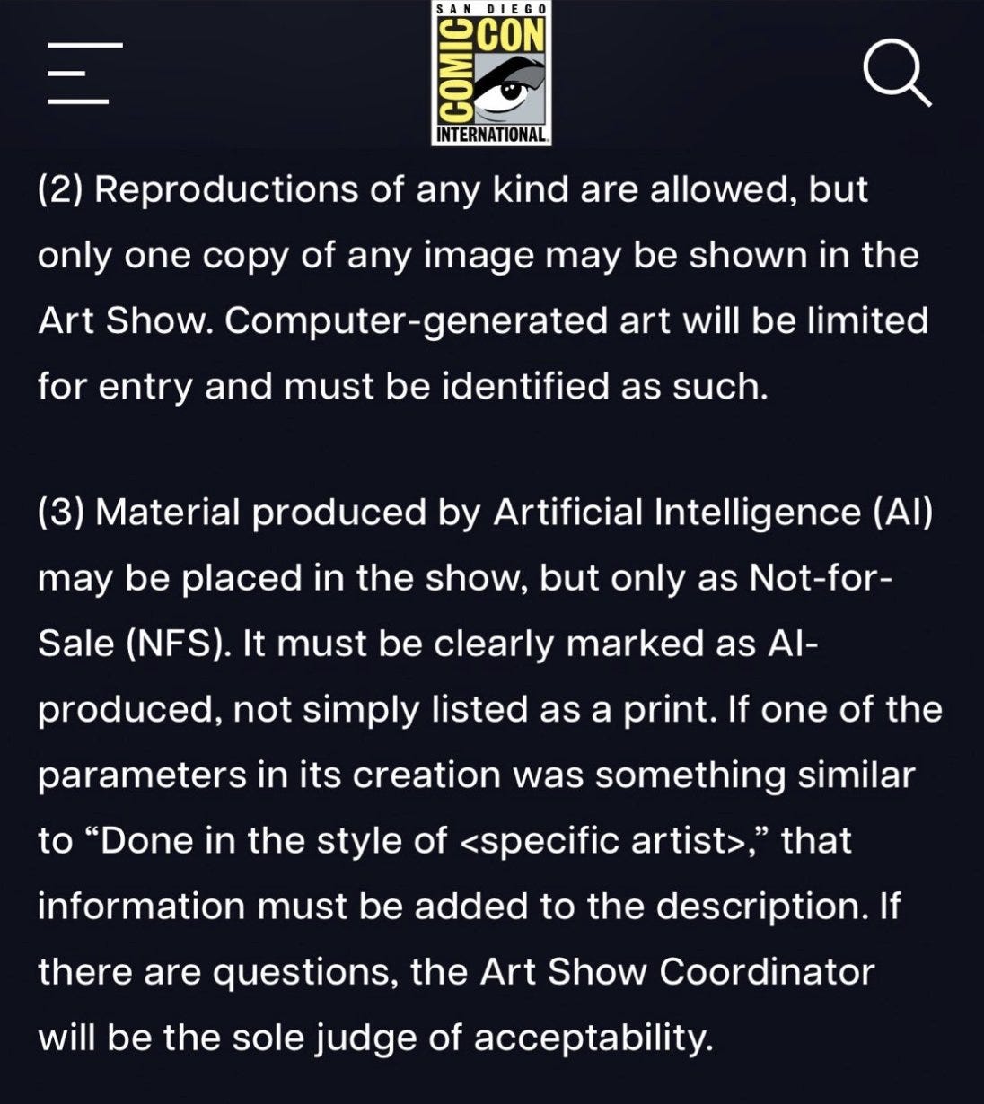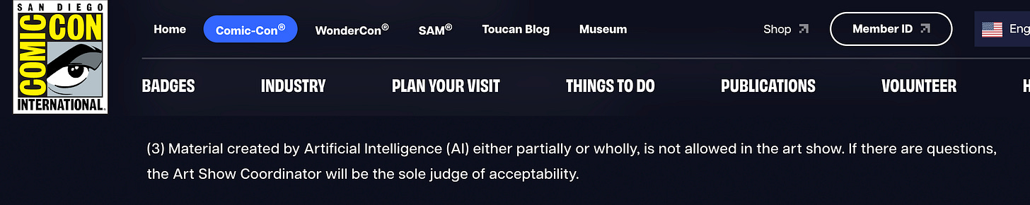 This policy has now been implemented at the biggest convention of all, San Diego Comic-Con, which announced this week that AI art would be banned from its floors.