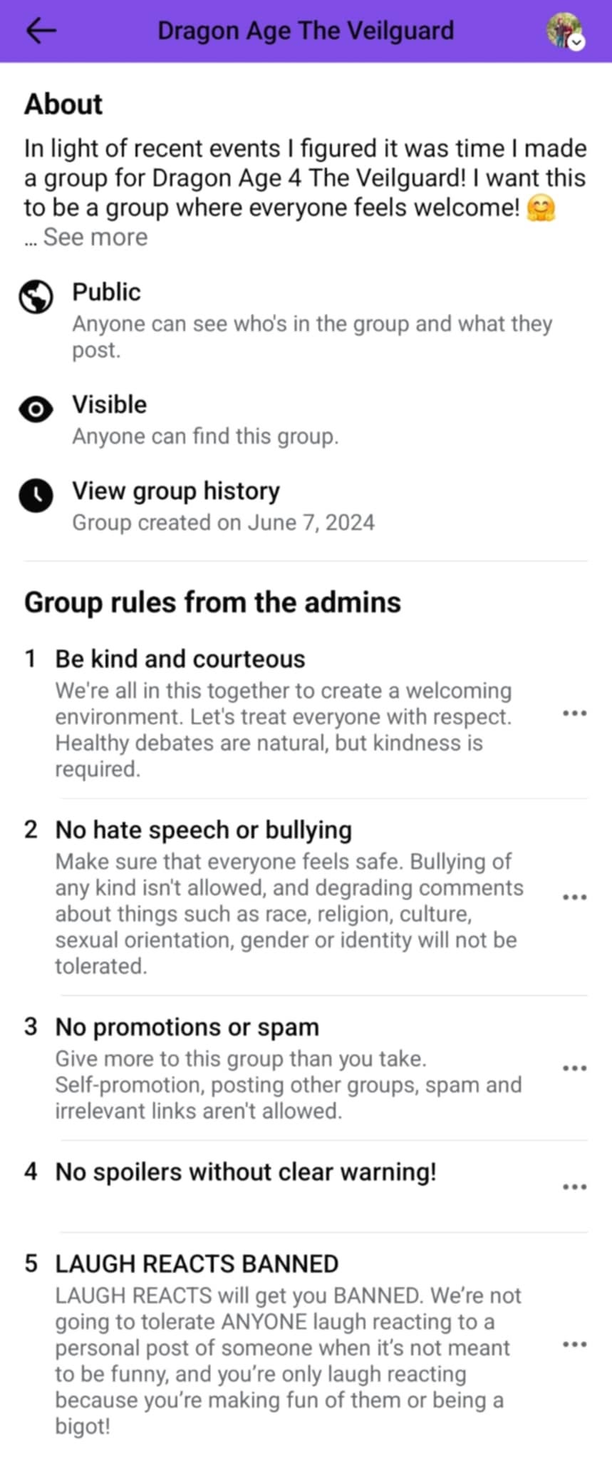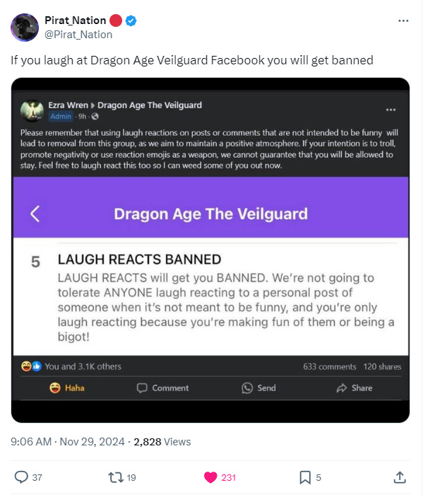 A nearly 13,000 member strong Dragon Age: The Veilguard Facebook group bans members from reacting to posts with laugh reactions.
