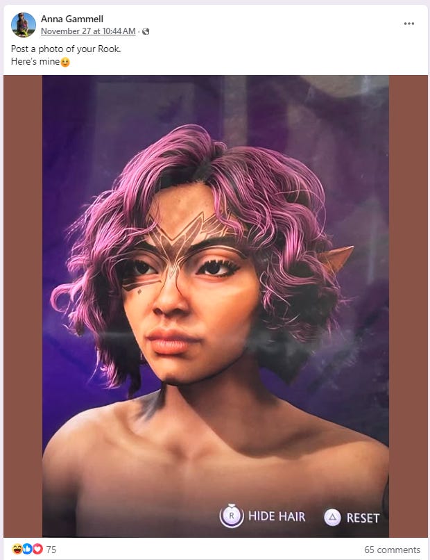 Anna Gammell posted, “Post a photo of your Rook. Here’s mine.”