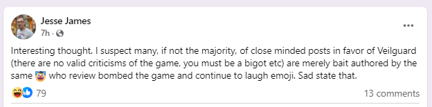 Jesse James posted, “Interesting thought. I suspect many, if not the majority, of close minded posts in favor of Veilguard (there are no valid criticisms of the game, you must be a bigot etc) are merely bait authored by the same [clown] who review bombed the game and continue to laugh emoji. Sad state that.”