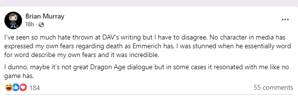 He added, “I dunno, maybe it's not great Dragon Age dialogue but in some cases it resonated with me like no game has.”