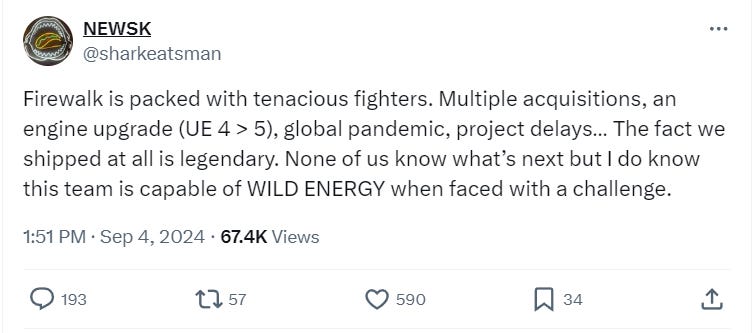 He then added, “Firewalk is packed with tenacious fighters. Multiple acquisitions, an engine upgrade (UE 4 > 5), global pandemic, project delays… The fact we shipped at all is legendary. None of us know what’s next but I do know this team is capable of WILD ENERGY when faced with a challenge.”