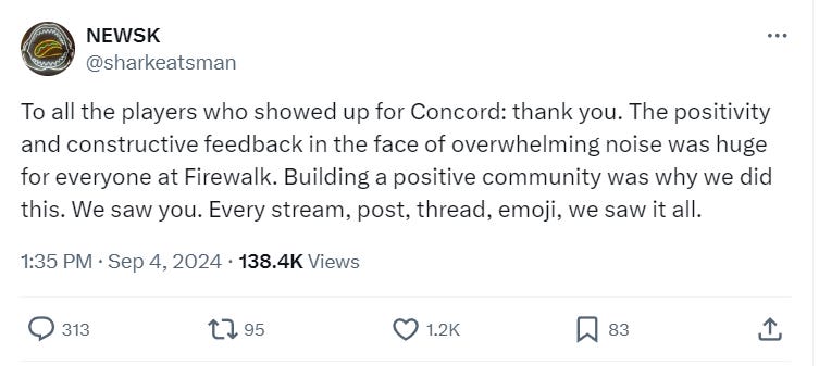 Weisnewski wrote on X, “To all the players who showed up for Concord: thank you. The positivity and constructive feedback in the face of overwhelming noise was huge for everyone at Firewalk. Building a positive community was why we did this. We saw you. Every stream, post, thread, emoji, we saw it all.”