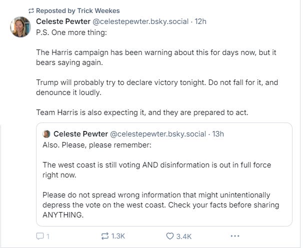 He also reposted Celeste Pewter who wrote, “P.S. One more thing: The Harris campaign has been warning about this for days now, but it bears saying again. Trump will probably try to declare victory tonight. Do not fall for it, and denounce it loudly. Team Harris is also expecting it, and they are prepared to act.”