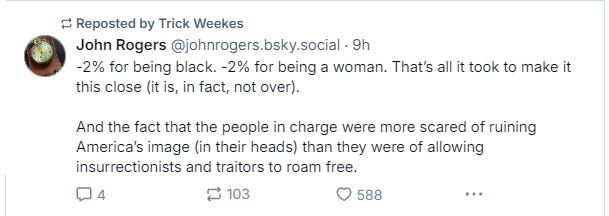 He also reposted John Rogers who wrote, “-2% for being black. -2% for being a woman. That’s all it took to make it this close (it is, in fact, not over). And the fact that the people in charge were more scared of ruining America’s image (in their heads) than they were of allowing insurrectionists and traitors to roam free.”