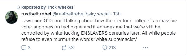 First, he reposted rustbelt rebel who wrote, “Lawrence O’Donnell talking about how the electoral college is a massive voter suppression technique and it enrages me that we’re still be controlled by white f***ing ENSLAVERS centuries later. All while people refuse to even murmur the words ‘white supremacist.’”