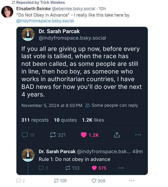 Beinke wrote, "‘Do Not Obey in Advance’ - I really like this take here by Sarah Parcak.”