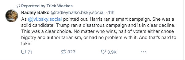 Next, Weekes reposted Radley Balko who posted, “As Jonathan Last pointed out, Harris ran a smart campaign. She was a solid candidate. Trump ran a disastrous campaign and is in clear decline. This was a clear choice. No matter who wins, half of voters either chose bigotry and authoritarianism, or had no problem with it. And that’s hard to take.”