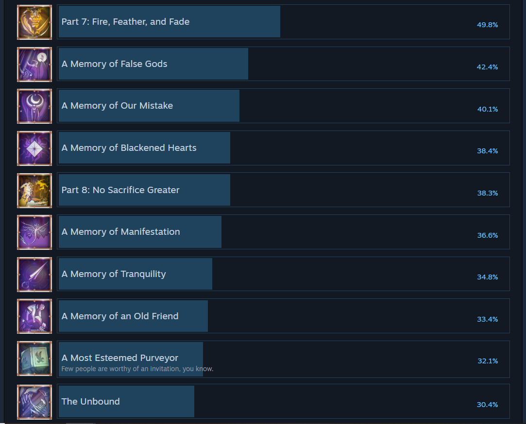 Those percentages have moved albeit marginally. Now, 49.8% of players have achieved the Part 7: Fire, Feather, and Fade achievement while 38.3% have completed Part 8: No Sacrifice Greater. Finally, only 16.8% achieved Part 14: The Dread Wolf Rises achievement.