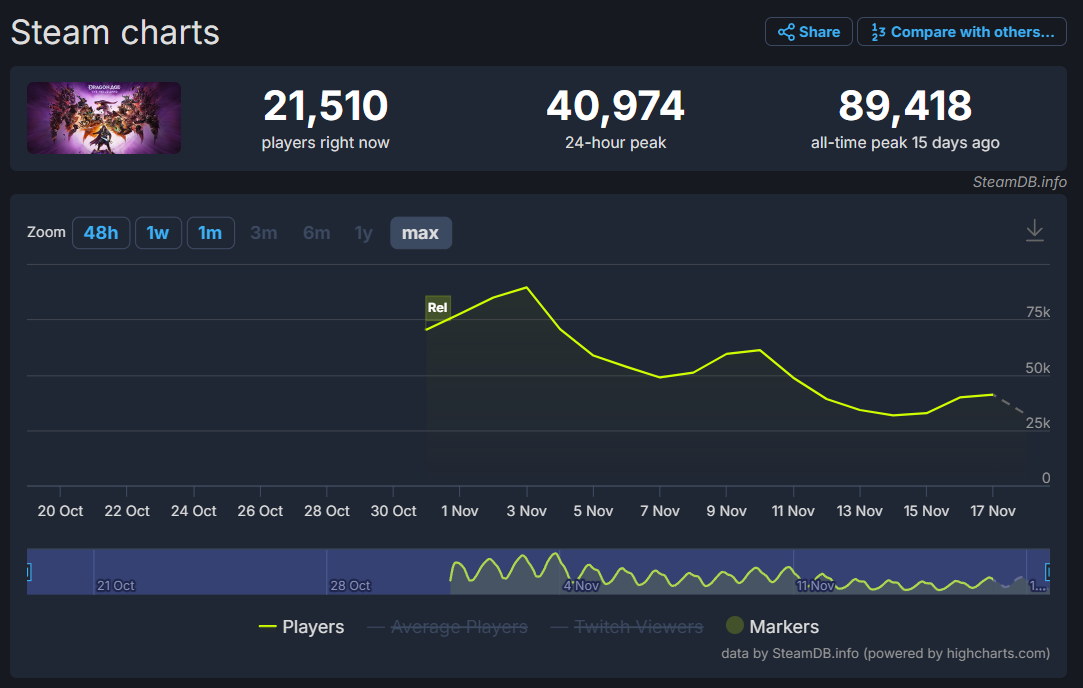 According to SteamDB, Dragon Age: The Veilguard’s most recent 24-hour peak only hit 40,974 concurrent players. That is a decline of 54.2% from the game’s all-time peak of 89,418 concurrent players.