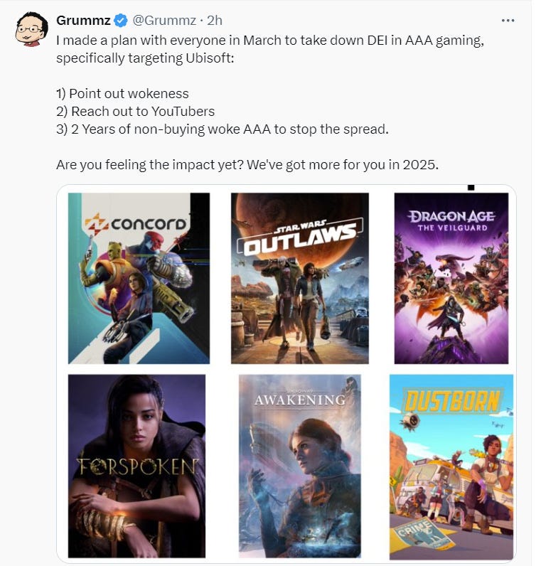 He reiterated this call about a week ago. He wrote on X, “I made a plan with everyone in March to take down DEI in AAA gaming, specifically targeting Ubisoft: 1) Point out wokeness 2) Reach out to YouTubers 3) 2 Years of non-buying woke AAA to stop the spread. Are you feeling the impact yet? We've got more for you in 2025.”