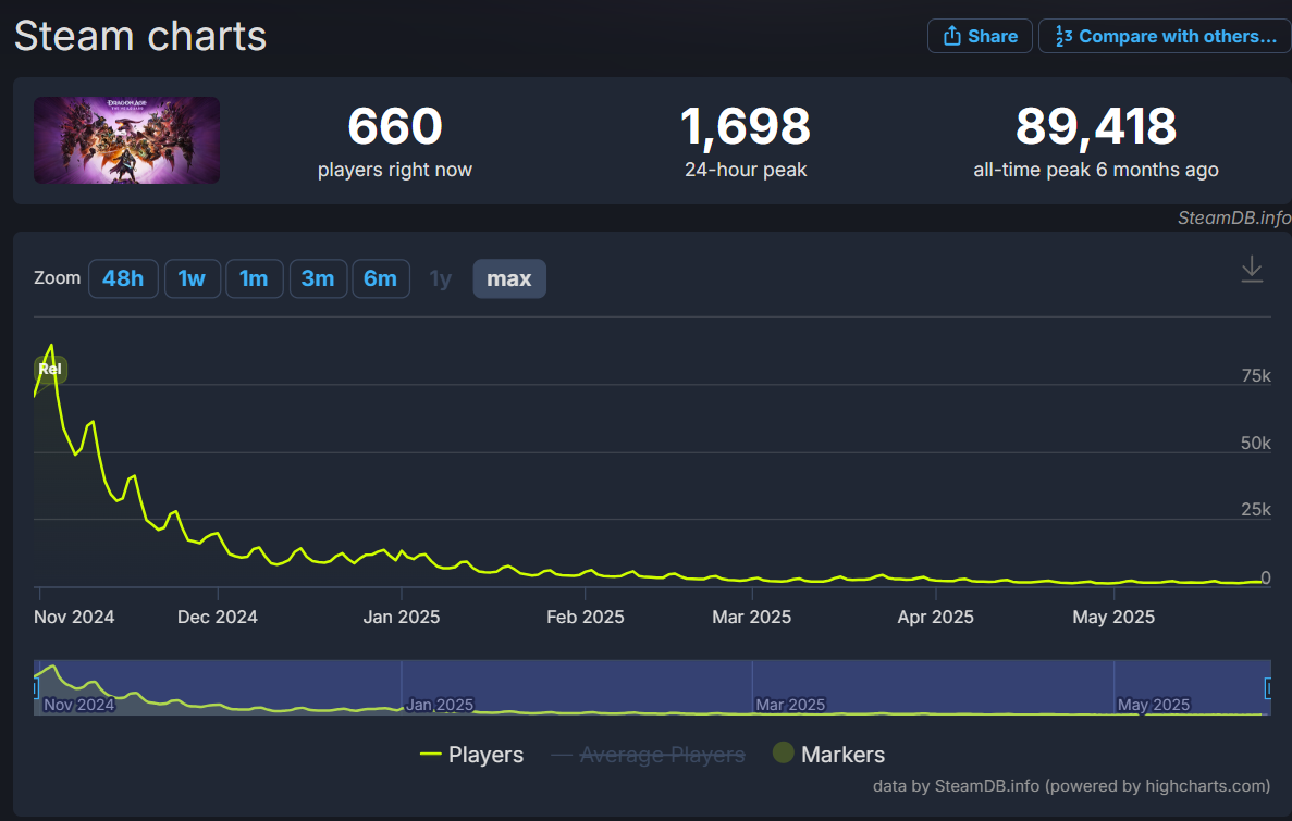 Dragon Age: The Veilguard failed out of the gate only hitting a peak concurrent player count of 89,418 on the first Sunday after its release in November. The game’s peak player counts have declined over 98% in less than 8 months. The most recent 24-hour peak only hit 1,698.