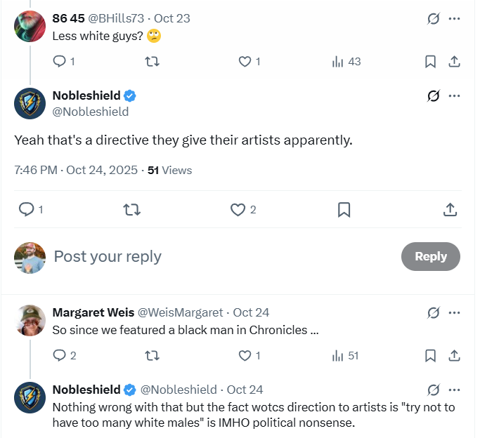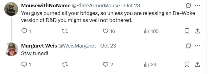 When another indicated that all bridges had been burned due to Wizards of the Coasts’ promotion of wokeness and the only thing to win him back would be a De-Woke version, Weis replied, “Stay tuned!”
