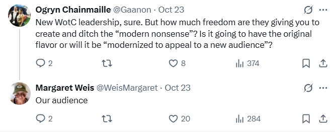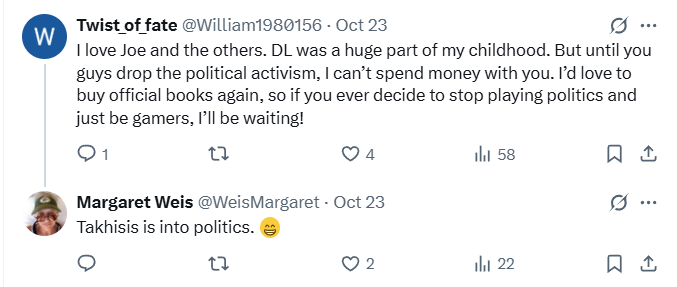 When another indicated he was uninterested in Wizards of the Coasts woke politics, Weis cheekily replied, “Takhisis is into politics.”