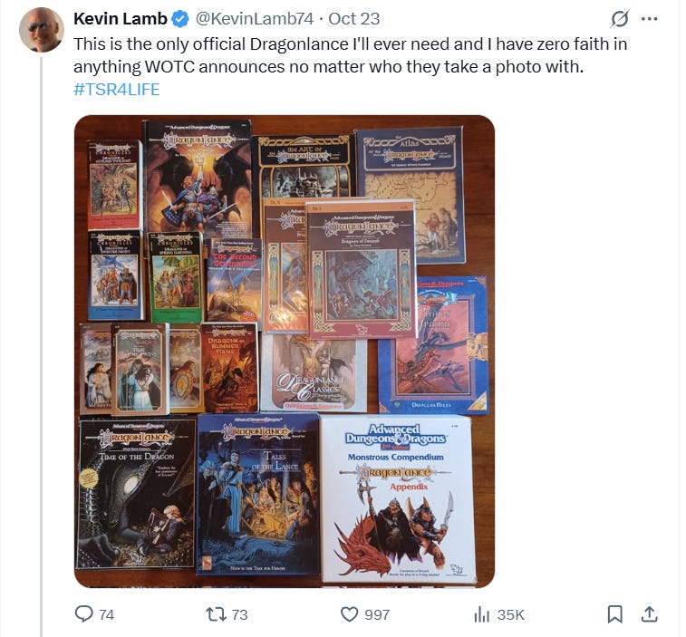 With the photo circulating, a number of Dragonlance fans made it clear they were uninterested in anything being added to the property. Kevin Lamb posted, “This is the only official Dragonlance I’ll ever need and I have zero faith in anything WOTC announces no matter who they take a photo with.”