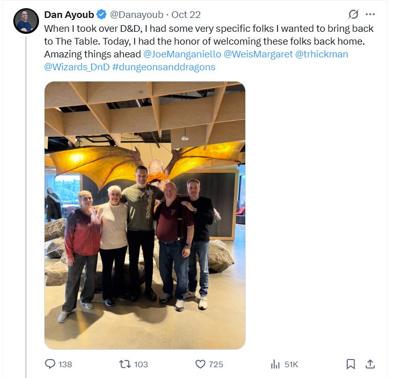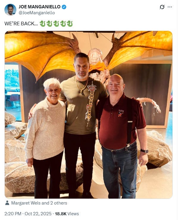 Back on October 22nd, Dragonlance creators Margaret Weis and Tracy Hickman were photographed next to Joe Manganiello and the photo was shared to social media by Dan Ayoub the Senior Vice President and Head of Dungeons & Dragons Franchise at Wizards of the Coast.