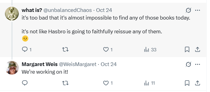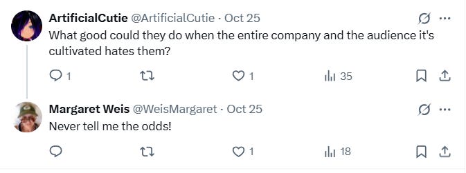 Numerous others shared their hesitation at anything being done with Dragonlance given Wizards of the Coasts recent track record and promotion of wokeness. Nevertheless, Weis attempted to assuage those fears. To one she wrote, “Never tell me the odds!”