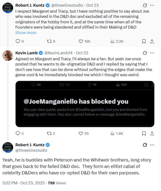 He later added, “[Manganiello] is buddies with [Jon] Peterson and the Whitweir brothers, long story that goes back to the failed D&D doc. They form an elitist cabal of celebrity D&Ders who have co-opted D&D for their own purposes.