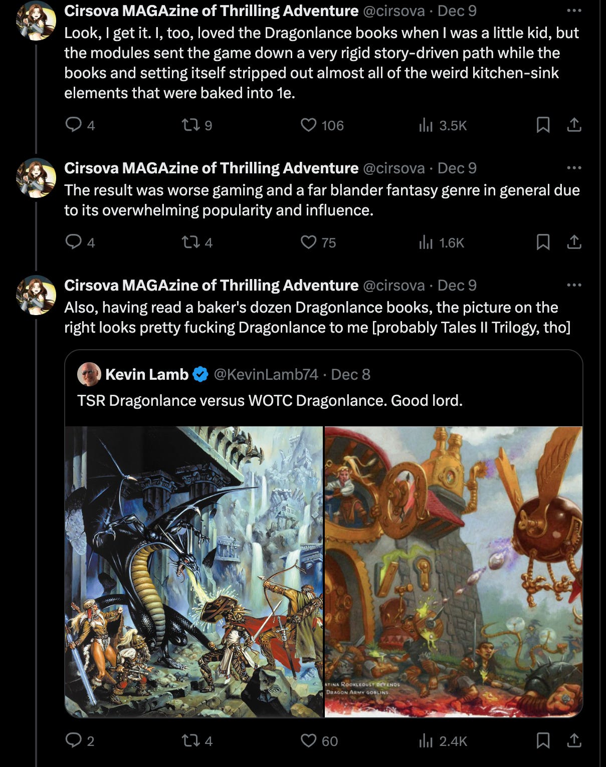 The posts caused controversy among those who loved the original books. However, Dragonlance does mark the beginning of an end for AD&D as it was the beginning of a host of products meant to be read and not played at the table, which watered down the RPG as the Cirsova editor said.