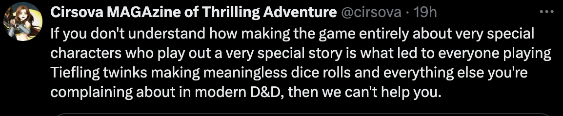 He followed up on the thread later, saying, “If you don't understand how making the game entirely about very special characters who play out a very special story is what led to everyone playing Tiefling twinks making meaningless dice rolls and everything else you're complaining about in modern D&D, then we can't help you.”