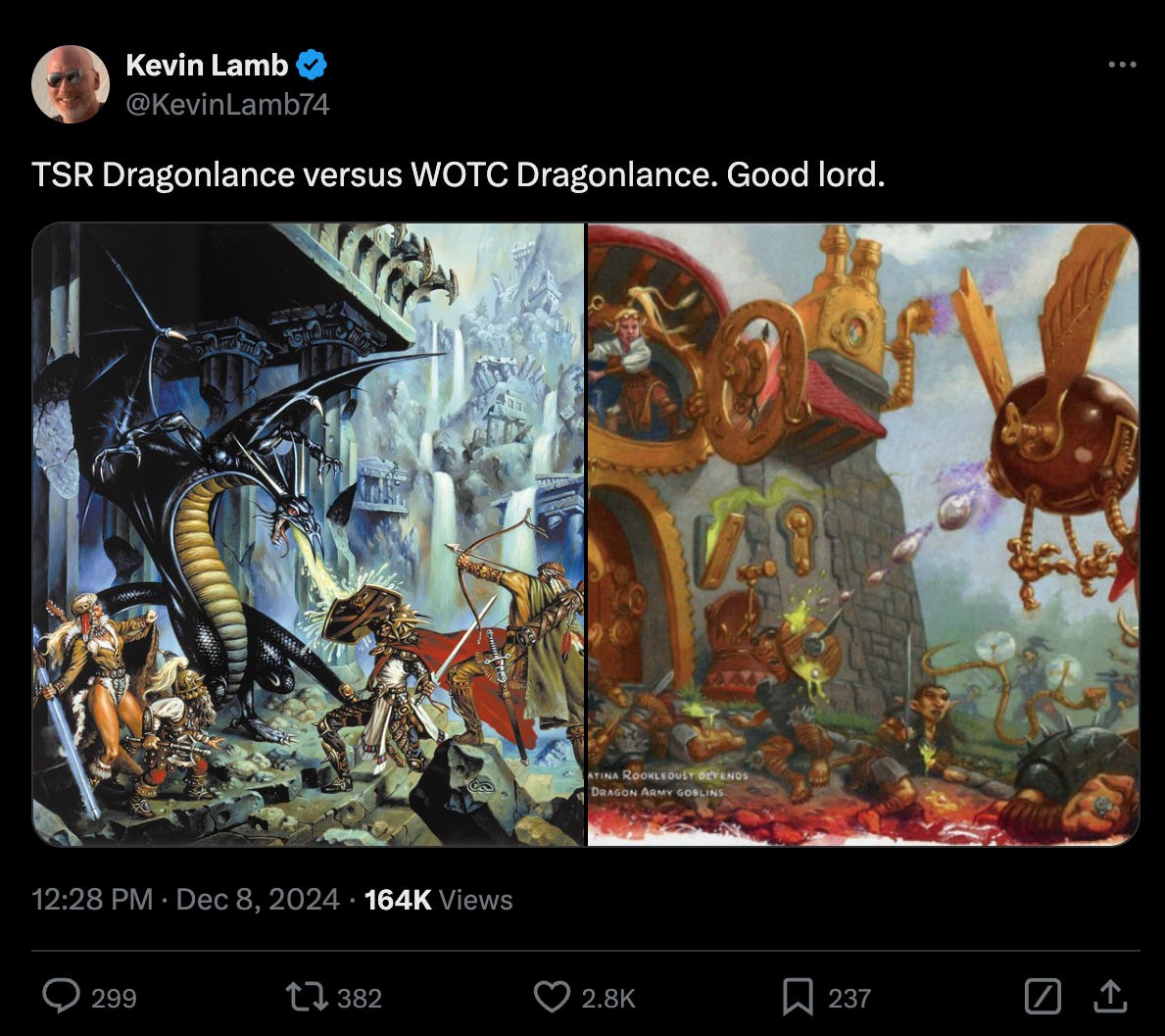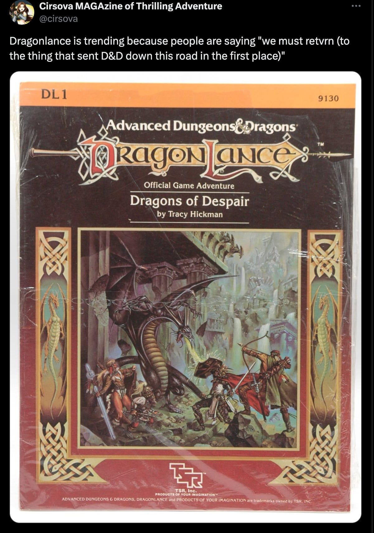 The editor posted to X as Dragonlance began to trend, “Dragonlance is trending because people are saying ‘we must retvrn (to the thing that sent D&D down this road in the first place)’”