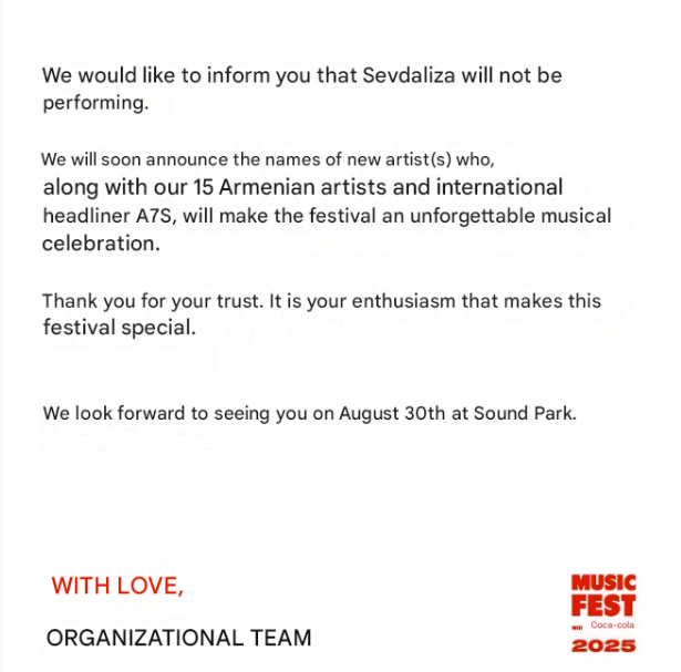 Two days later and the festival announced that Sevdaliza would no longer be performing. It stated in another Instagram post, “We would like to inform you that Sevdaliza will not be performing. We will soon announce the names of new artist(s) who, along with our 15 Armenian artists and international headliner A7s, will make the festival an unforgettable musical celebration. Thank you for your trust. It is your enthusiasm that makes this festival special.”