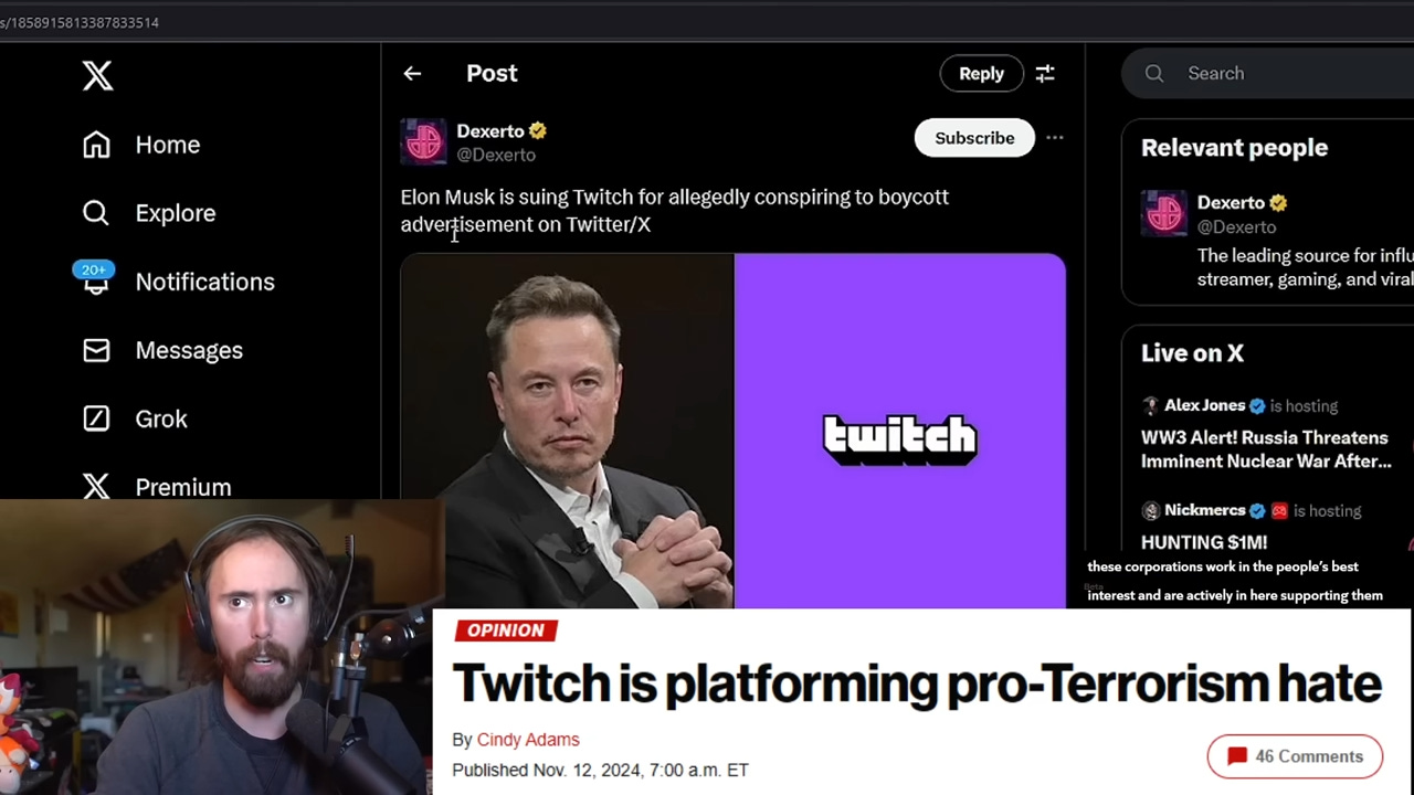 When Dexerto published an article about Asmongold’s comments, he followed up in response to their post on X. “Companies operating as a quasi-government in order to compel behavior should concern everyone. I know a lot of people hate Elon, but hopefully the greater evil of companies acting collectively as cartels is evident by now. Anti-trust laws exist for a reason.”