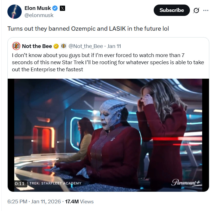 Reacting to a clip of the show shared to X by Not the Bee, Musk wrote, “Turns out they banned Ozempic and LASIK in the future lol.”