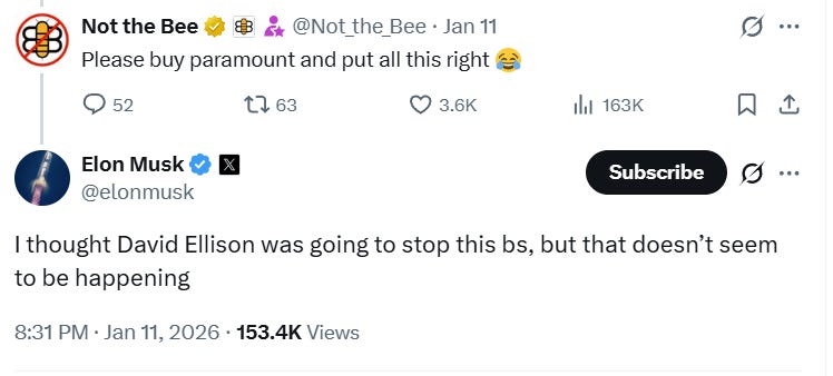 After Not the Bee encouraged Musk to purchase Paramount and “put all this right,” Musk questioned, “I thought David Ellison was going to stop this bs, but that doesn’t seem to be happening”