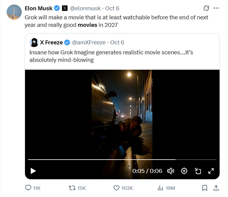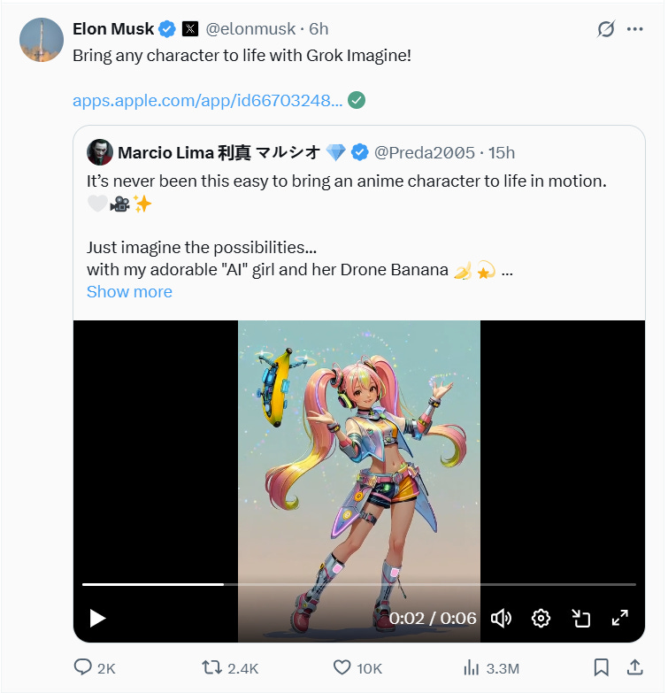 More recently he claims his Grok Imagine product can “Bring any character to life with Grok Imagine!”