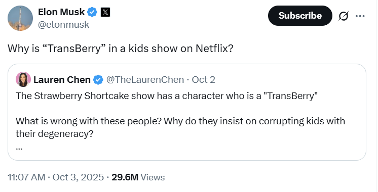 The last time Musk posted about Netflix was on October 3rd. He wrote, “Why is “TransBerry” in a kids show on Netflix?”