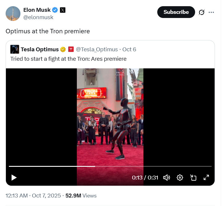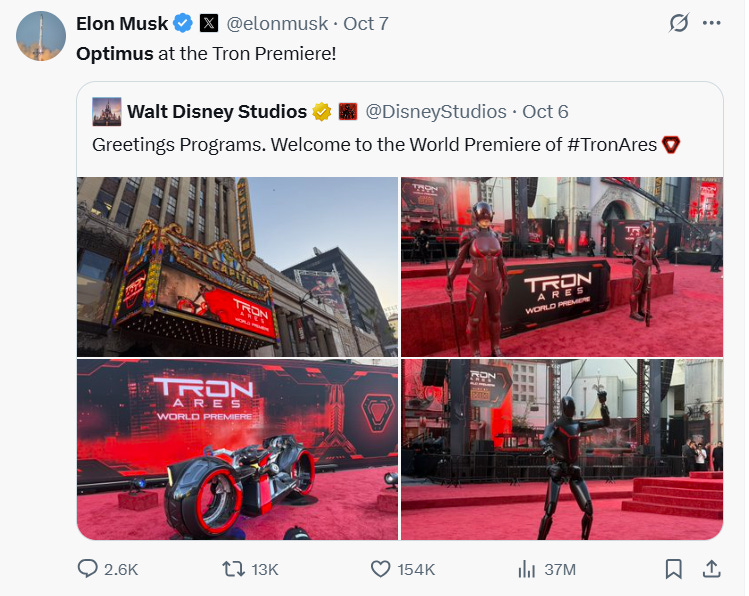 On top of this, Musk was promoting his Optimus robot in an obvious marketing collaboration with The Walt Disney Company’s Tron: Ares.