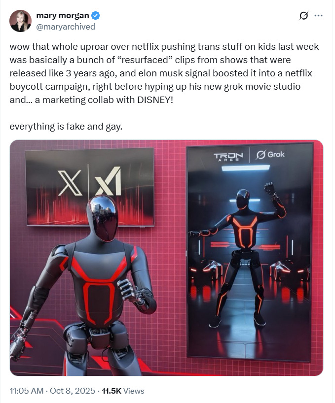 Morgan posted to X, “wow that whole uproar over netflix pushing trans stuff on kids last week was basically a bunch of “resurfaced” clips from shows that were released like 3 years ago, and elon musk signal boosted it into a netflix boycott campaign, right before hyping up his new grok movie studio and… a marketing collab with DISNEY!”