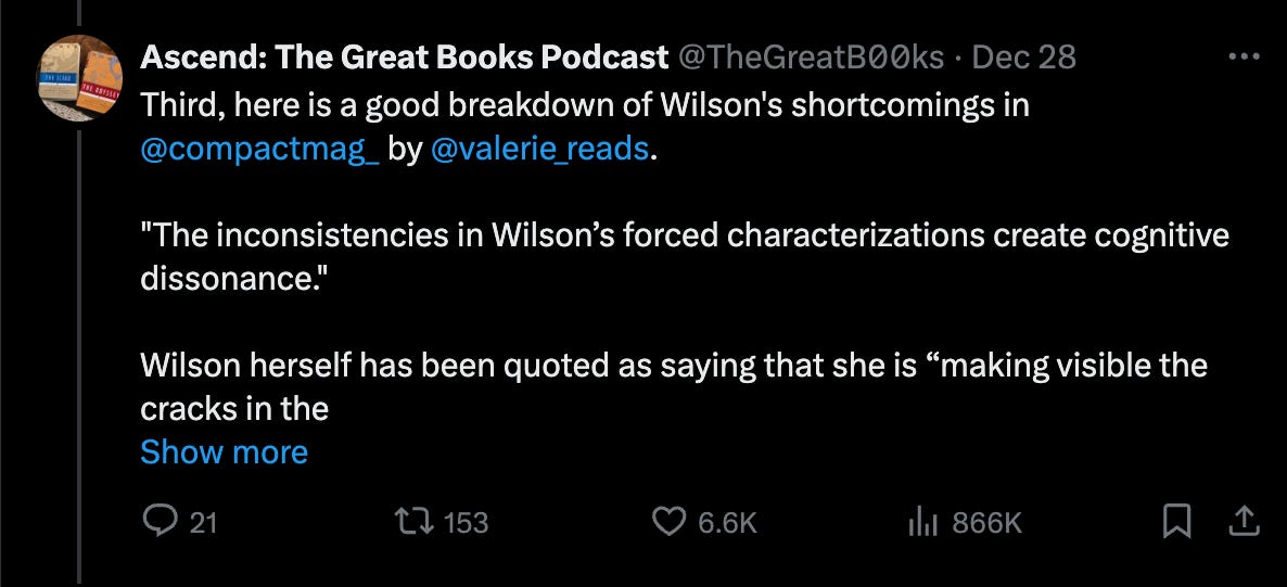The Ascend podcast also pointed out a review of Wilson by Compact Magazine’s Valerie Stitvers, who said, “‘The inconsistencies in Wilson’s forced characterizations create cognitive dissonance.’ Wilson herself has been quoted as saying that she is ‘making visible the cracks in the patriarchal fantasy.’”