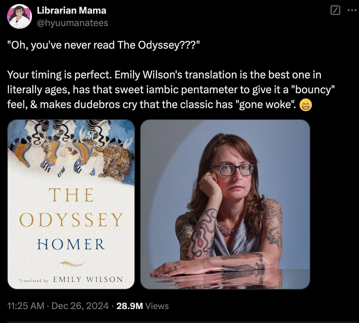 Originally promoted by an X account that goes by Librarian Mama, Emily Wilson’s translation of The Odyssey came to the internet’s attention with a viral post. The account posted, “‘Oh, you've never read The Odyssey???’ Your timing is perfect. Emily Wilson's translation is the best one in literally ages, has that sweet iambic pentameter to give it a ‘bouncy’ feel, & makes dudebros cry that the classic has ‘gone woke’.”