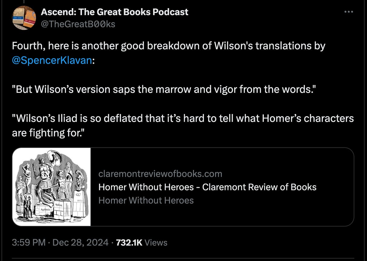 He concludes by urging readers to spend their time wisely, saying, “We only have a certain amount of time to read, and we want to use that time to read great books. And if we are going to take the time to read great books, we need great translations that pass along the wisdom of the ancients. Use Fagles or Lattimore. Not Wilson's.”