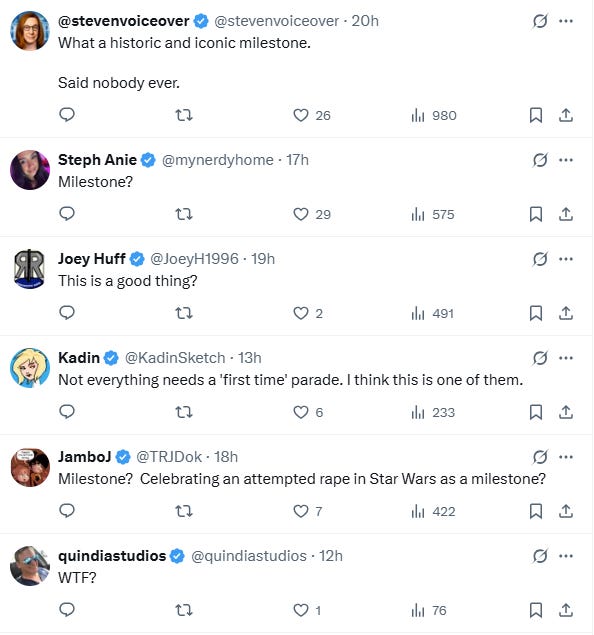 JamboJ wrote, “Milestone? Celebrating an attempted rape in Star Wars as a milestone?”
