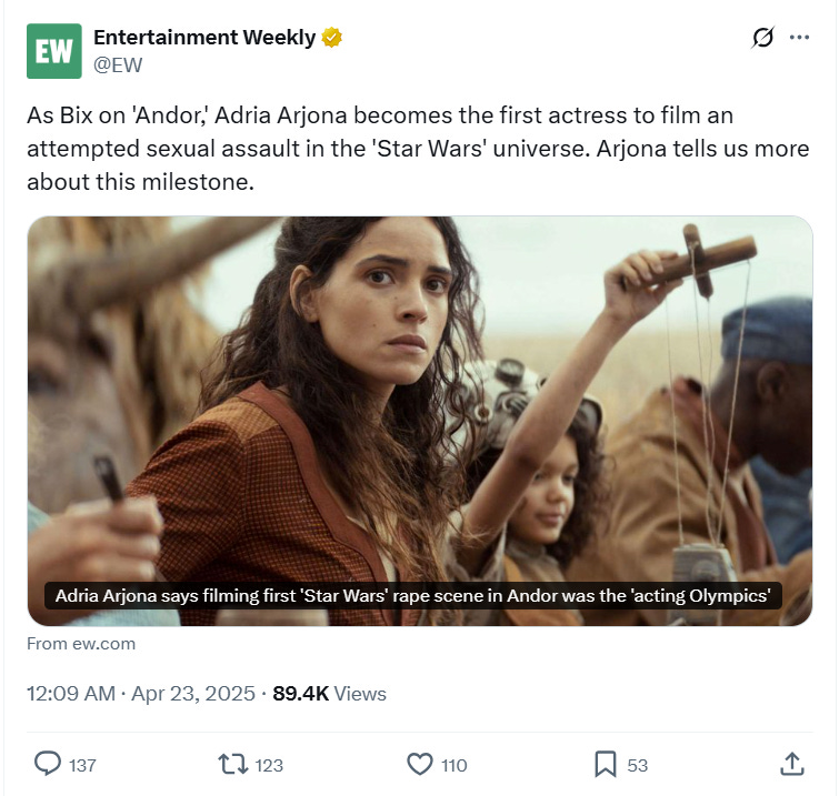 Access media outlet Entertainment Weekly described the filming of a sexual assault scene in the third episode of Andor Season 2 as a Star Wars milestone while promoting their interview with actress Adria Arjona.
