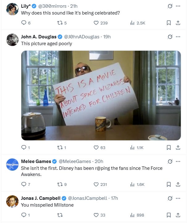 “She isn't the first,” wrote Melee Games. “Disney has been r@ping the fans since The Force Awakens.”