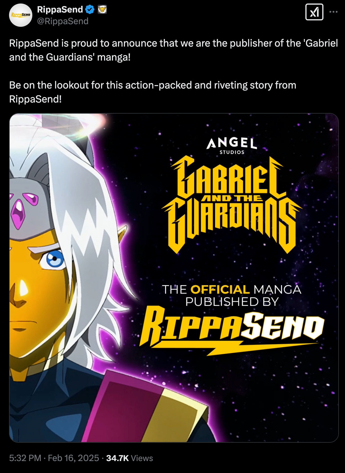 There, he posted, “RippaSend is proud to announce that we are the publisher of the 'Gabriel and the Guardians' manga! Be on the lookout for this action-packed and riveting story from RippaSend!”