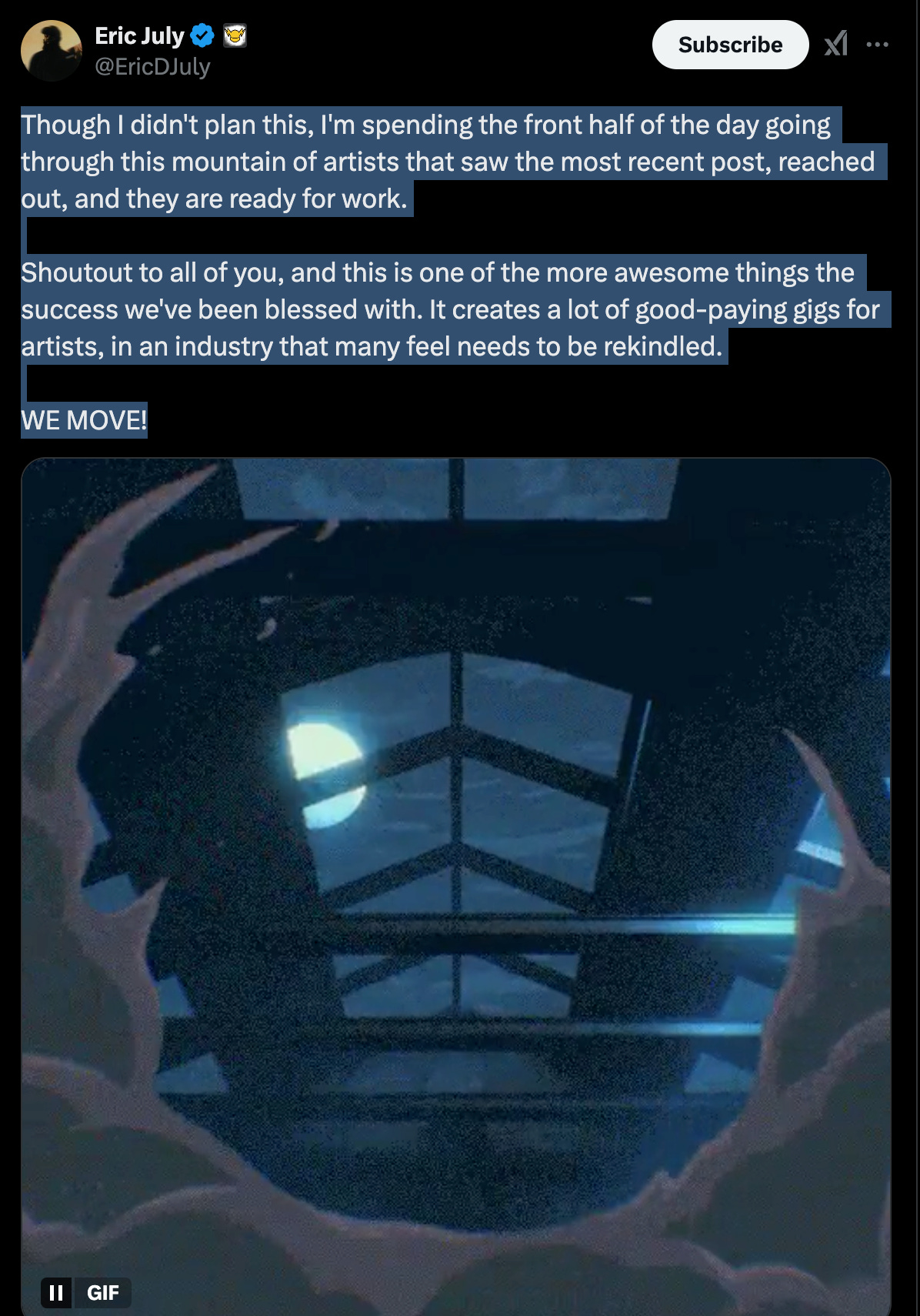 Eric July, however, noted that there are a large number of artists who responded because of the situation, leading him to comb through different portfolios almost immediately to fill the vacancies presented by this studio. He said in a follow up, “Though I didn't plan this, I'm spending the front half of the day going through this mountain of artists that saw the most recent post, reached out, and they are ready for work. Shoutout to all of you, and this is one of the more awesome things the success we've been blessed with. It creates a lot of good-paying gigs for artists, in an industry that many feel needs to be rekindled. WE MOVE!”