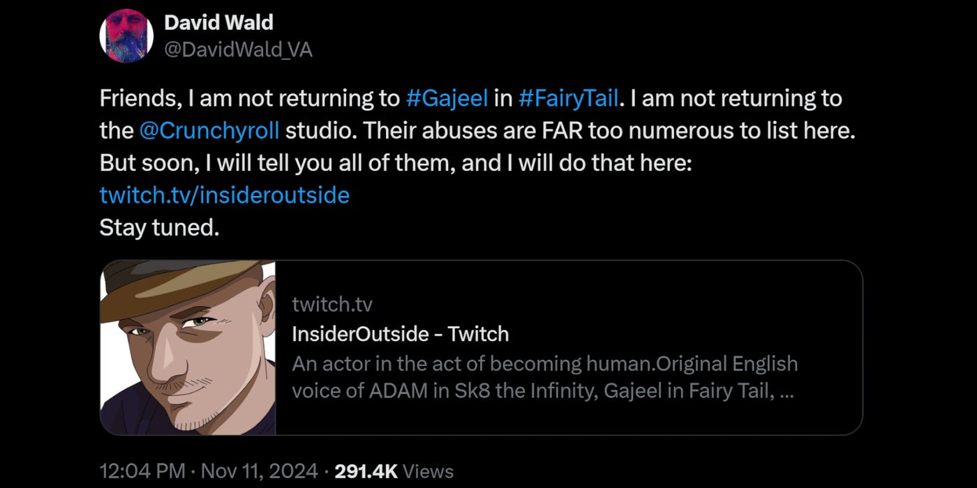 Ex-Funimation Voice Actor David Wald Accuses Crunchyroll of Abuse and Hostile Work Environment After Fan Mail Stealing Scandal
