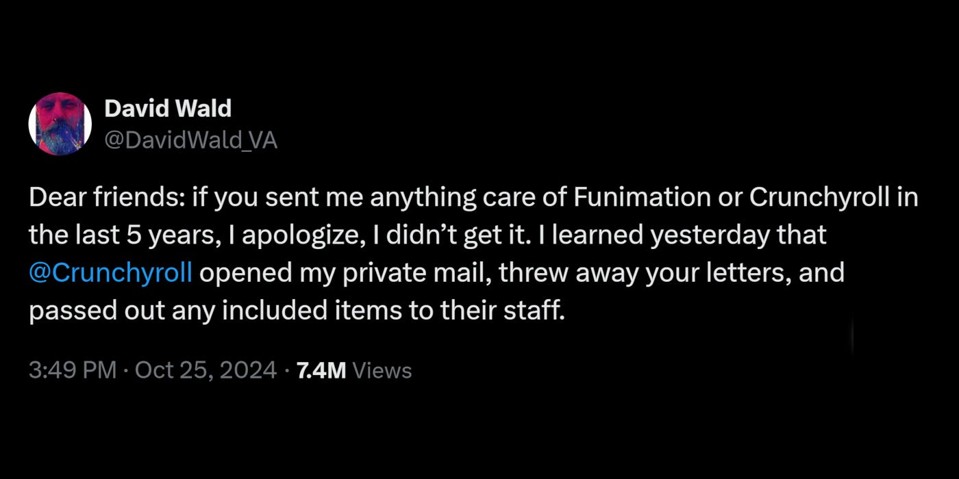 On Friday, October 25th, Wald wrote to his X account that Crunchyroll, which was acquired by Sony and merged with Funimation back in 2021, had been opening his fan mail and giving it out to employees at the San Francisco company.