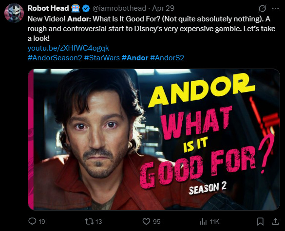I possess a freedom most of critic YouTube doesn't. I don't have to talk about Star Wars. I don't even have to acknowledge its existence if I don't want to. Because I've got my own thing that the Left can't tear down. I can exist in action and not reaction.