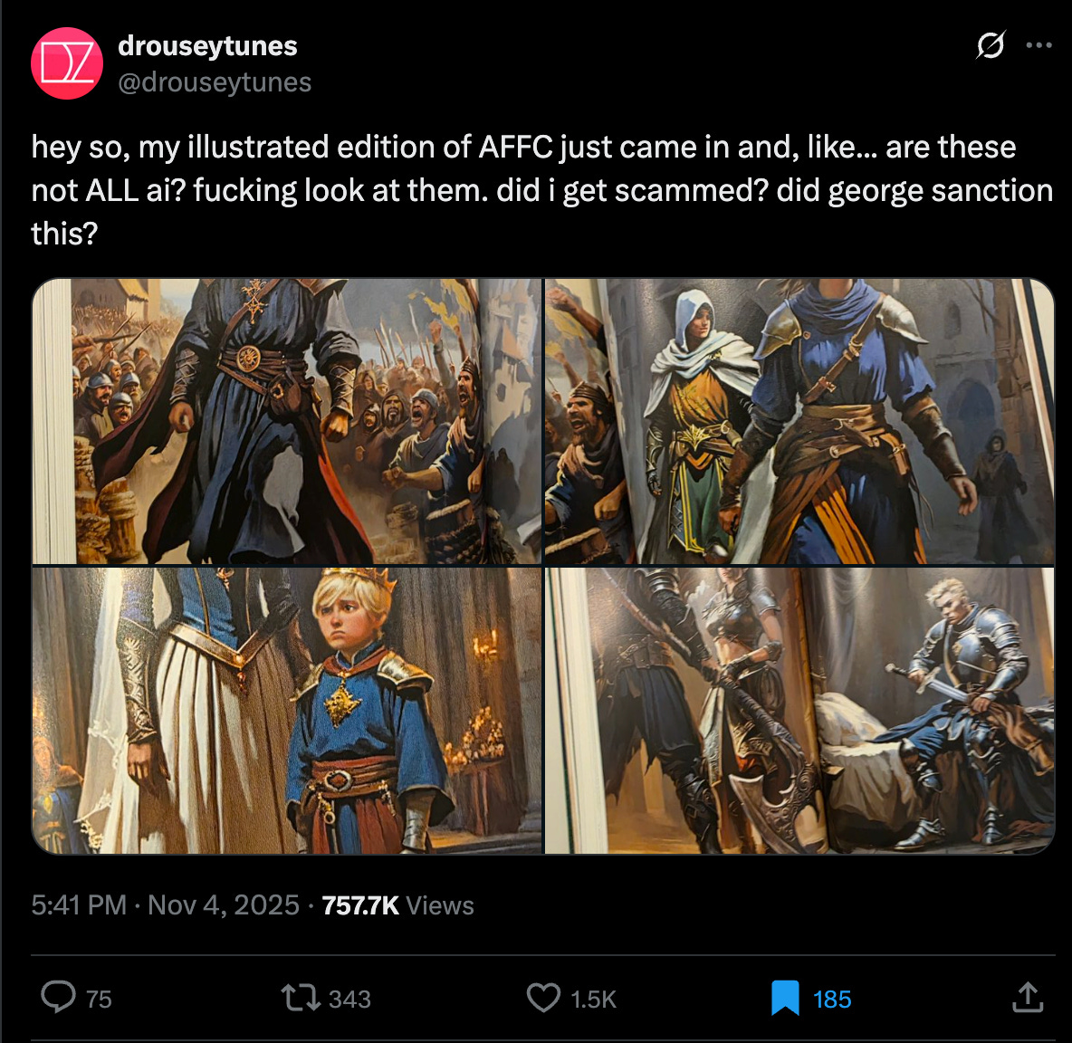 The $50 deluxe edition hit shelves on November 4, 2025, and fans immediately noticed something wrong. X user @drouseytunes broke the story in a viral thread, posting images from the book with a simple question: “hey so, my illustrated edition of AFFC just came in and, like... are these not ALL ai? fucking look at them. did i get scammed? did george sanction this?”