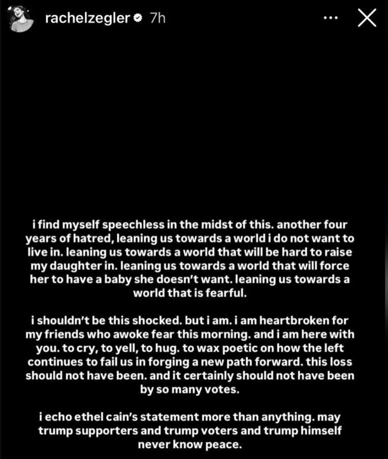 As noted above, Zegler wished “trump supports and trump voters and trump himself never know peace.”