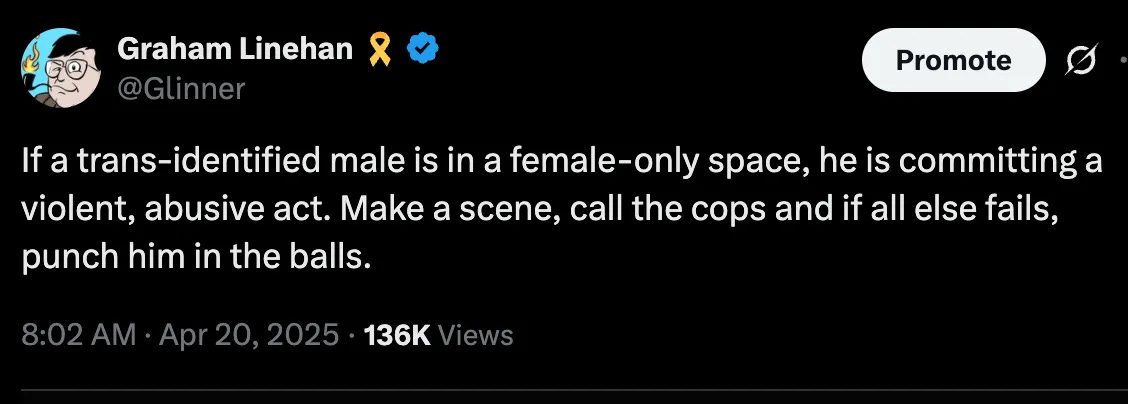 As for the posts in question. He shared that one read, “If a trans-identified male is in a female-only space, he is committing a violent, abusive act. Make a scene, call the cops and if all else fails, punch him in the balls.”