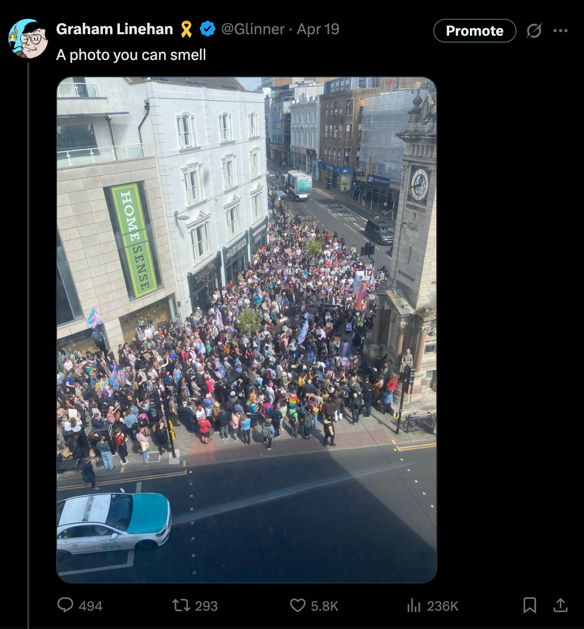 The second he simply captioned a photo of what appears to be some kind of LGBT march or protest. He wrote, “A photo you can smell.”